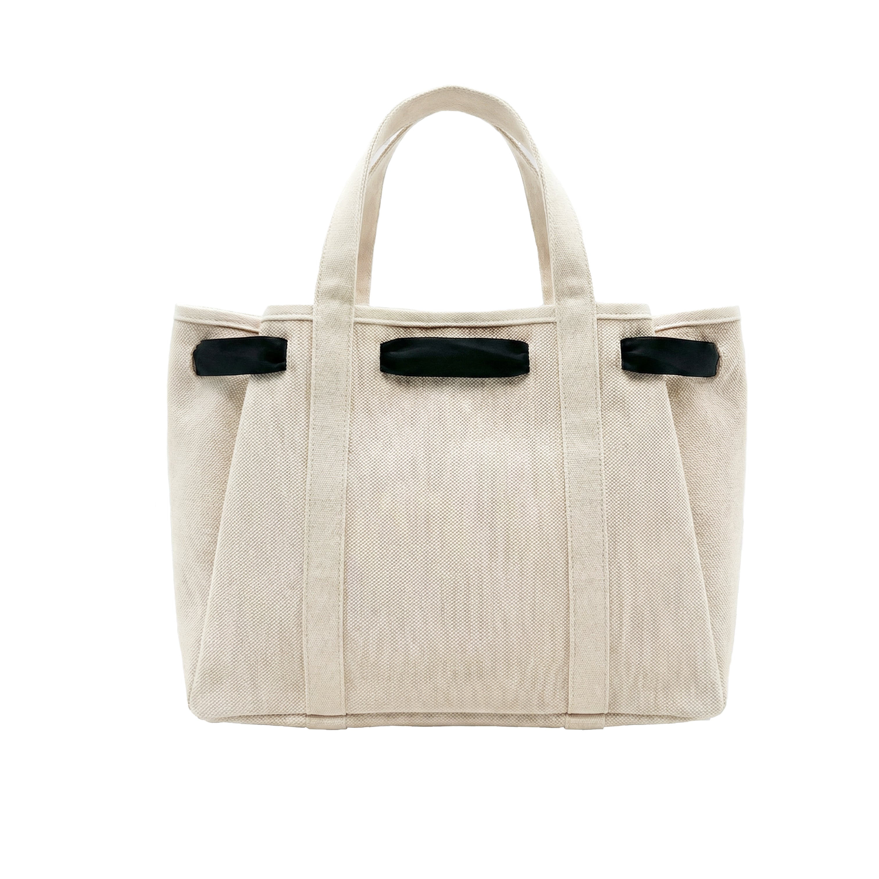 A structured canvas tote designed to carry you through your day with effortless style. Features a removable black ribbon scarf (includes a pink scarf for versatile styling) that lets you switch up your look, tie it in a knot, bow, or remove it completely.